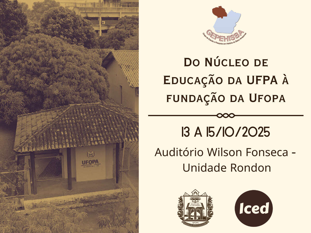 O Grupo de Estudos e Pesquisa em História do Baixo Amazonas (GEPEHISBA), em parceria com Instituto de Ciências da Educação (ICED/UFOPA), oconvida a comunidade acadêmica para o evento “Do Núcleo de Educação da UFPA à fundação da Ufopa”, que será realizado de 13 a 15 de outubro de 2025, no Auditório Wilson Fonseca, Unidade Rondon.