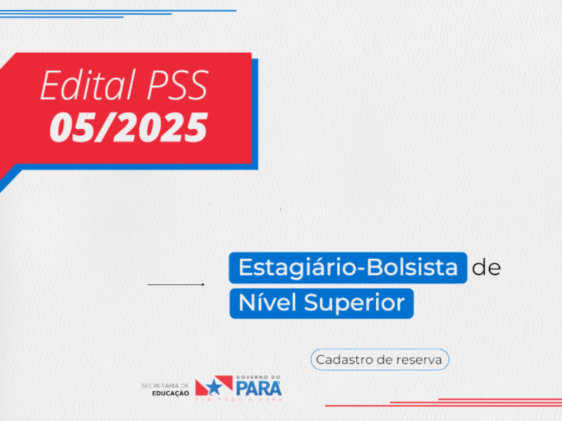 A Comissão de Avaliação do Processo Seletivo Simplificado da Secretaria de Educação do Pará, instituída pela Portaria nº 018/2024 – GS/SEDUC está realizando Processo Seletivo Simplificado para formação de cadastro reserva visando à contratação de estagiários-bolsistas de nível superior, regularmente matriculados em cursos de Licenciatura reconhecidos pelo Ministério da Educação (MEC).